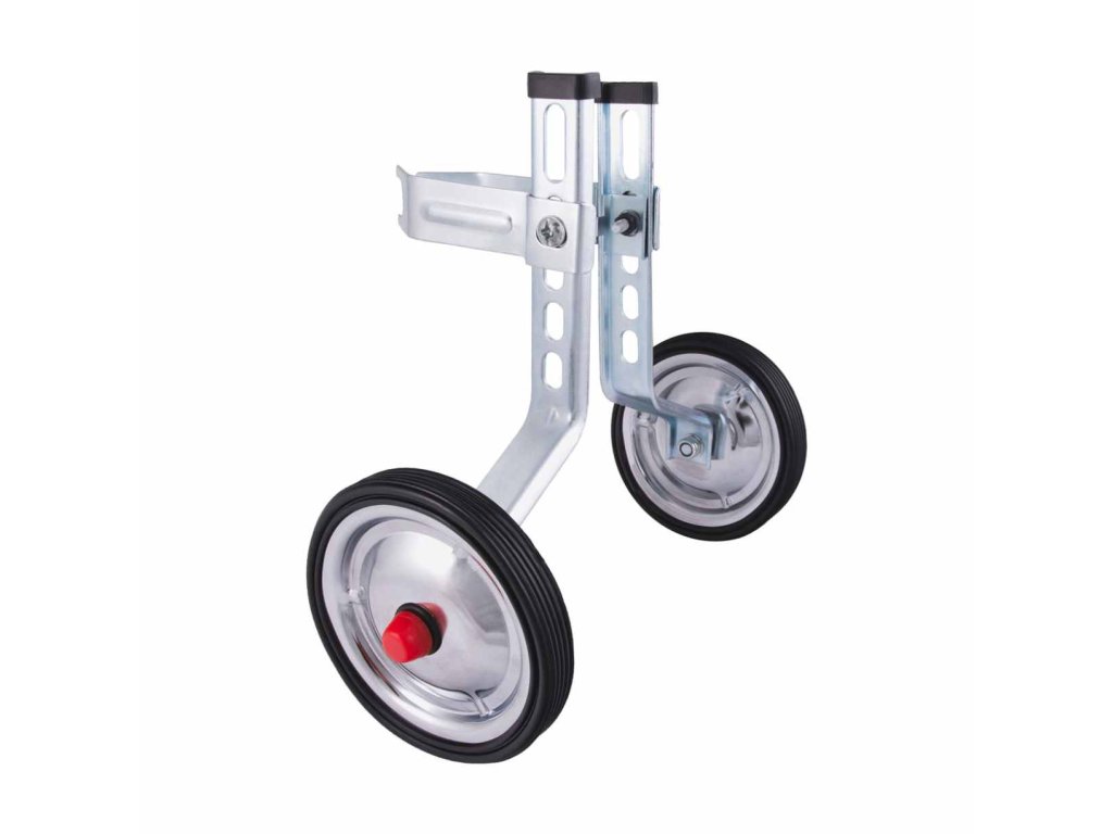 - Pomocné kolieska pre začínajúcich cyklistov. Gumené kolieska s oceľovým stredom majú dlhú životnosť a mäkký chod. Pevný úchyt z oceľového profilu hrúbky 3 mm a bezpečnostnými ramenami a podložkami držia kolieska pevne na svojom mieste aj pri nabehnutí na prekážku. Oceľový profil s otvormi umožňuje nastaviť kolieska pre bicykle s 12-20" kolesami.