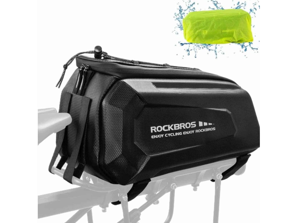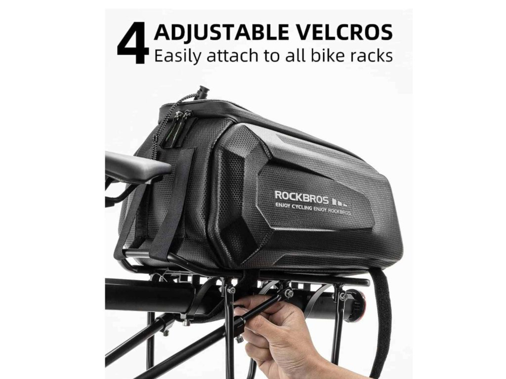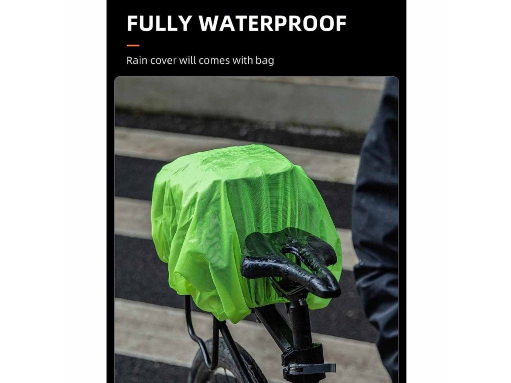 Taška na zadný nosič, pevná škrupina s návlekom proti dažďu. Kapacita 9L - Rozmer 13,2 x 7,9 x 8,65 (D x Š x V), s 2 vnútornými sieťovanými vreckami. Táto taška má dostatočnú kapacitu na uloženie všetkých vašich cyklistických potrieb, ako sú pumpičky na pneumatiky, káblový zámok, bunda atď. Elastická šnúrka na taške vám tiež pomôže uviazať veľa vecí, ktoré potrebujete. Táto taška využíva vystuženú pevnú škrupinu polyesteru potiahnutú PU, ktorá je odolná voči vode, odolná, ľahká a ľahko sa čistí. Vodotesné materiály a vodeodolný dvojitý zips pomôžu udržať vaše vybavenie v suchu. Táto taška je dodávaná aj s pláštenkou, takže sa nebojte bicyklovať v daždivom dni.