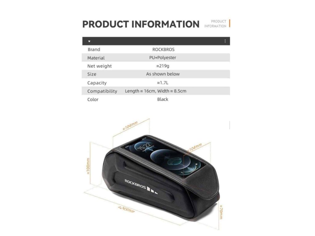 Taška na hornú rámovú trubku , vyrobená z vodotesného materiálu polyuretánu (PU) a etylénvinylacetátu (EVA). Vonkajšia vrstva z uhlíkového vlákna. Taška je odolná proti dažďu aj vďaka vodotesným zipsom. Vnútorný priestor je rozdelený dvoma sieťovanými prepážkami. Veľká kapacita: 24,5 × 10,4 × 10 cm. Cca 1,7 l. Taška je dostatočne veľká pre každodennú cyklistiku. Môžete do nej vložiť svoje veci ako mini pumpu, smartfón, peňaženku, kľúče atď. Jednoduchá inštalácia, s 3 suchými zipsami ju veľmi pevne pripevníte k rámu. Ľahká demontáž je samozrejmosťou, keď opustíte bicykel. Ak sú suché zipsy príliš dlhé, môžete ich odstrihnúť. Mobilný telefón môžete bez problémov používať vďaka vysoko citlivému, priehľadnému TPU priezoru bez toho, aby ste museli mobil vybrať z tašky. Je vhodná pre smartfóny veľkosti pod 6,8 palcov.